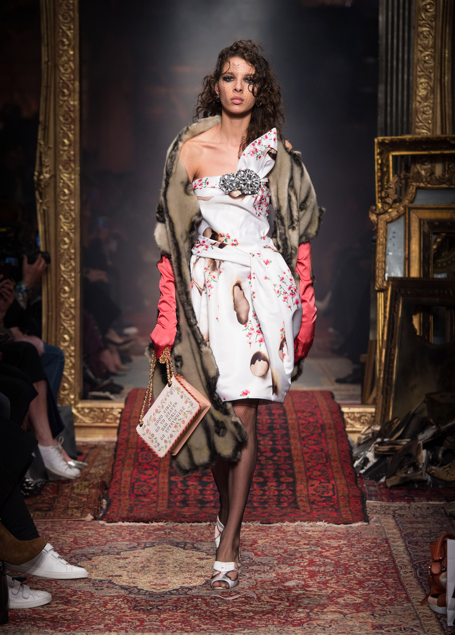 Paraded down a carpeted catwalk between empty gilded picture frames, the Swarovski-crystal chandelier formed a sparkling skirt over a simple black dress. Other garments in Scott's collection appeared to have been salvaged from the flames, with singed holes in the fabric. Brightly coloured dresses with oversized bows and gathered fabric at the hips featured blackened outlines and uneven hems to also look scorched.